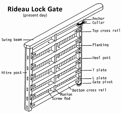 | Rideau Lock GateAn illustration of the components of a present day Rideau lock gate (gate bridle not shown). Illustration by Suzanne Plousos from "Working with Tools," 1996. |